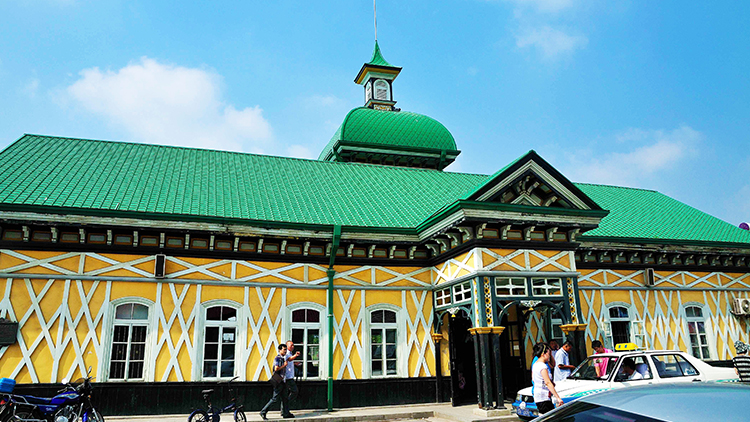 这座建筑由俄藉工程师吉尔什曼负责建筑施工。砖木结构,小巧别致,更多体现俄罗斯木构建筑特色。建筑造型简洁明快,平面呈一字形,立面在入口处加设门斗,中间顶部为绿色穹顶塔楼,加强了中央体积向上的动感。塔楼上面挂着鱼鳞状铁皮瓦片,显现着几分俄罗斯乡土情趣。站台上的木结构风雨棚构架合理,美感十足,与站舍浑然一体。